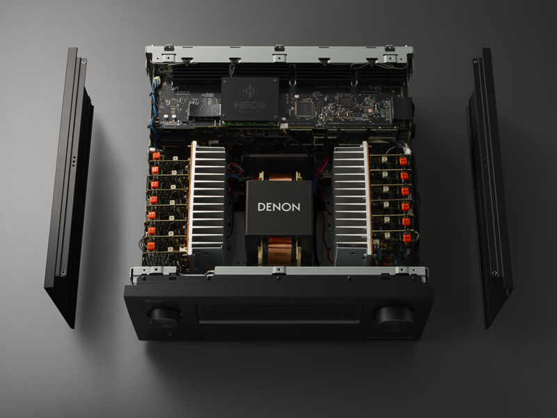 Le A1H repose sur un châssis haute rigidité dimensionné pour les fortes charges thermiques et mécaniques, associé au plus gros transformateur jamais monté par Denon sur un AVR.