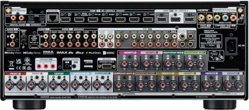 Sur le plan audio/numérique, Denon annonce neuf DAC stéréo « audiophiles » afin d’alimenter les 17 canaux gérés (enceintes + subs), une connectique pré-out 15.4 pour des assignations souples*, et l’écosystème HEOS Built-in (multiroom/streaming) avec AirPlay 2.