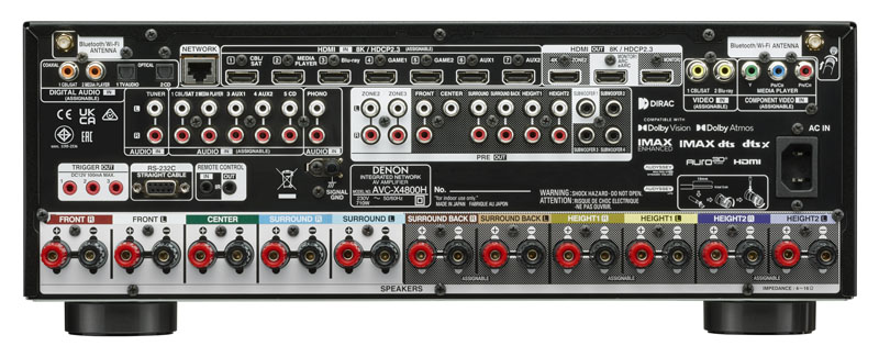 Le décodage couvre Dolby Atmos, DTS:X, IMAX Enhanced et Auro-3D ; les quatre sorties caisson sont indépendantes pour optimiser la distribution du grave. Conception et fabrication sont annoncées au Japon.
